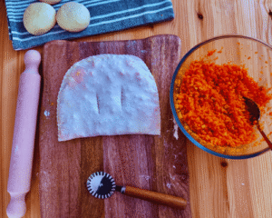 2. Jede Teigkugel sehr dünn ausrollen. Die Kürbisfüllung dünn verteilen, dabei am Rand 1–2 cm frei lassen. Zuklappen, die Ränder gut verschließen und überschüssigen Teig abschneiden.
