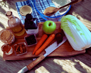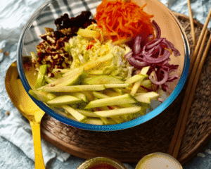 - Gemüse vorbereiten:Chinakohl fein schneiden, Apfel in dünne Stifte oder kleine Würfel schneiden. Karotte raspeln und die rote Zwiebel in feine Ringe oder Würfel schneiden.